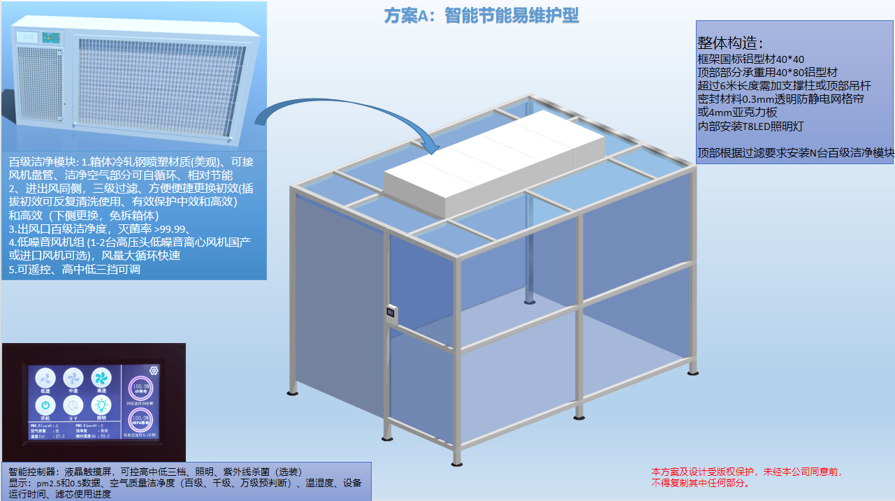 模塊化組裝,支持移動(dòng)(可選萬(wàn)向輪)、擴(kuò)展或調(diào)整潔凈級(jí)別(百級(jí)至十萬(wàn)級(jí))。